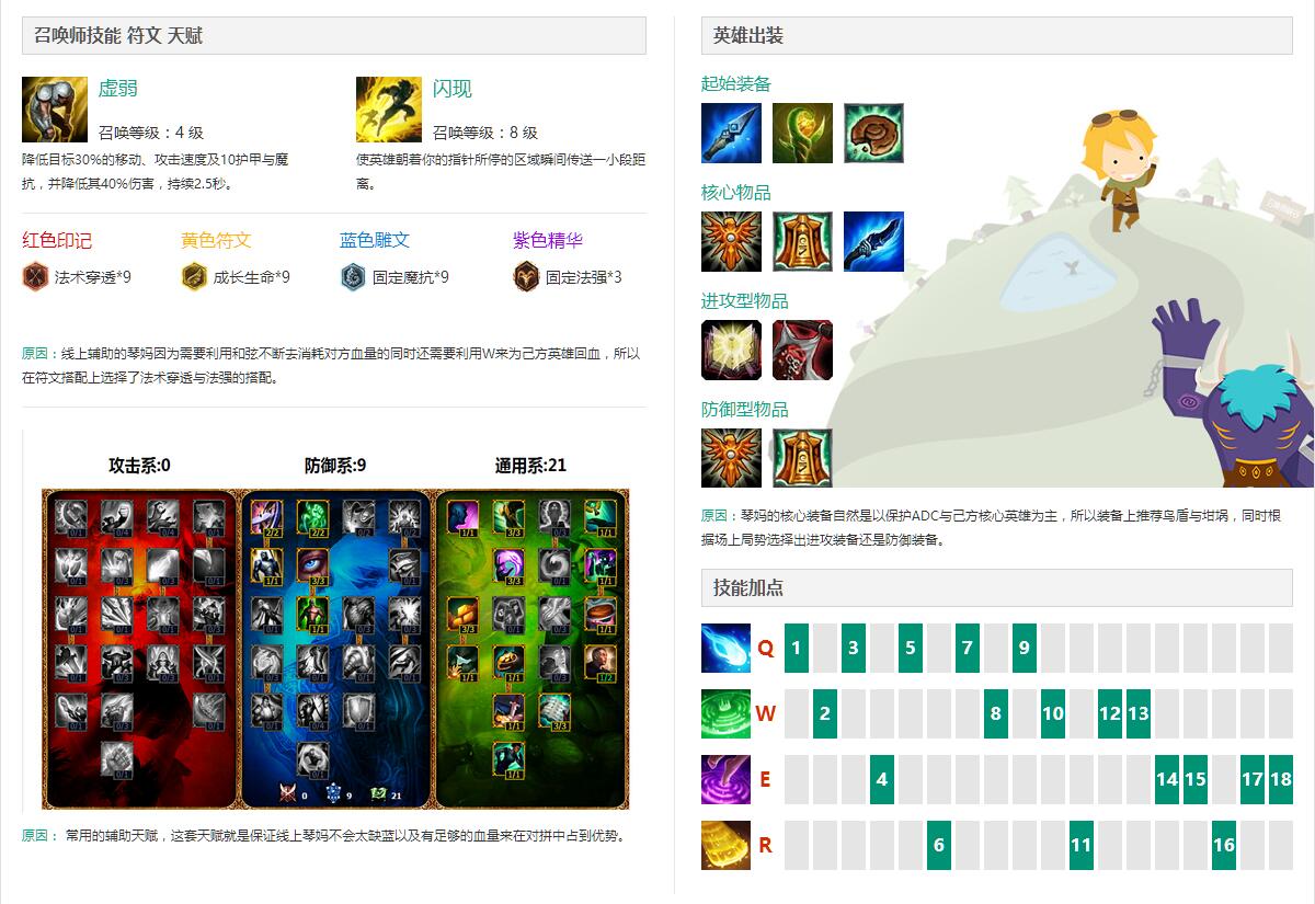 星妈既然是辅助自然是要以保护与续航为主,技能加点上则是需要保证加血的同时依然要提供伤害能力,所以就是主Q副W来让二者兼得。
